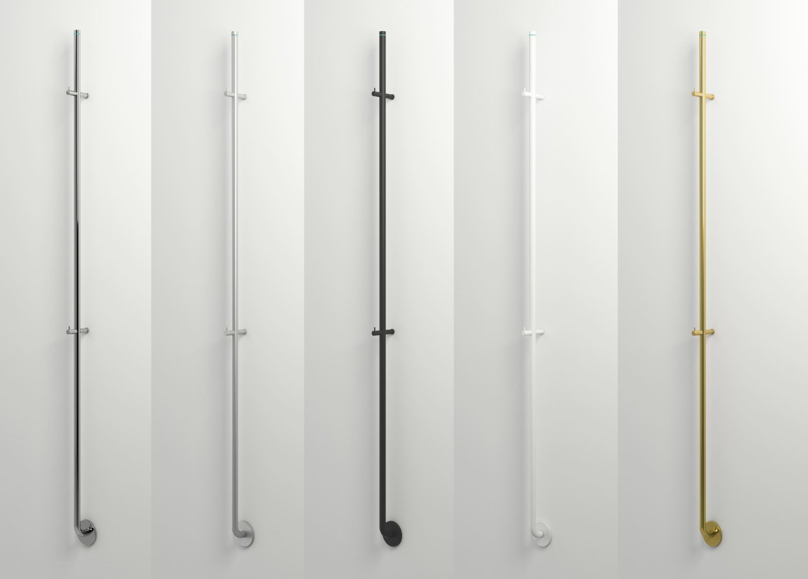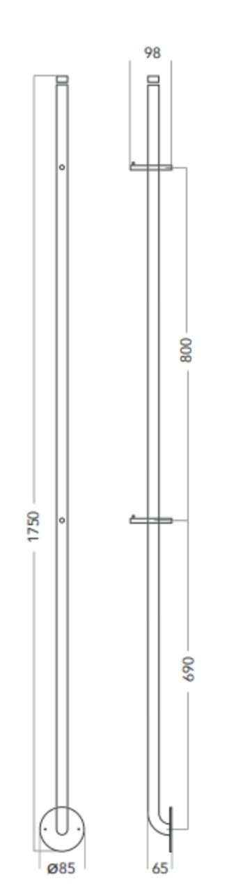 De warmer met een hoogtemaat van 1750mm, is gemaakt van geborsteld of gepolijst roestvast staal en is ook leverbaar in het soft zwart, soft wit en messing.