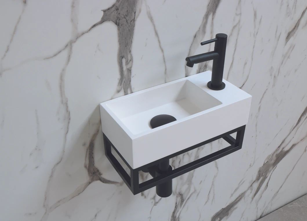 De fontein is ook vrij, op een frame op te hangen en is verkrijgbaar in 2 verschillende materialen.